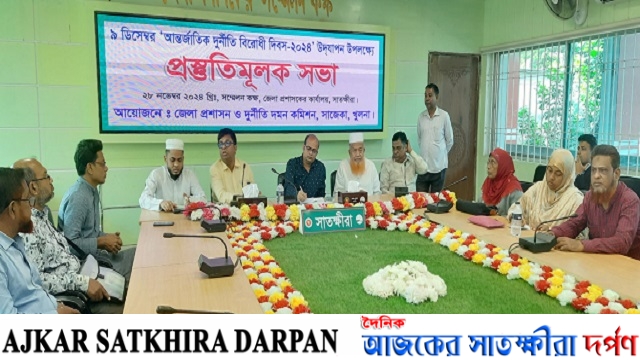 নিজস্ব প্রতিনিধি : ৯ ডিসেম্বর আন্তর্জাতিক দুর্নীতি বিরোধী দিবস ২০২৪ উদযাপন উপলক্ষে প্রস্তুতিমূলক সভা অনুষ্ঠিত হয়েছে। বৃহস্পতিবার (২৮ নভেম্বর) দুপুরে জেলা প্রশাসকের সম্মেলন কক্ষে জেলা প্রশাসন ও দুর্নীতি দমন কমিশন সাজেকা, খুলনার আয়োজনে দুর্নীতি দমন কমিশন সাজেকা খুলনার উপপরিচালক মো, আব্দুল ওয়াদুদ’র সভাপতিত্বে প্রস্তুতিমূলক সভায় প্রধান অতিথি হিসেবে বক্তব্য রাখেন সাতক্ষীরার অতিরিক্ত জেলা প্রশাসক (সার্বিক) বিষ্ণুপদ পাল।