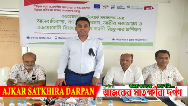আশাশুনি প্রতিনিধিঃ আশাশুনিতে এডভোকেসি নেটওয়ার্ক সদস্যদের জন্য মানবাধিকার, গনতন্ত্র, সুশাসন, নারীর ক্ষমতায়ন ও এডভোকেসি বিষয়ক দুই দিন ব্যাপী রিফ্রেশার প্রশিক্ষনের উদ্বোধন করা হয়েছে। বুধবার সকাল ১০টায় উপজেলা মুক্তিযোদ্ধা কমপ্লেক্স মিলনায়তনে অনুষ্ঠিত প্রশিক্ষণ কর্মশালার উদ্বোধন করেন উপজেলা নির্বাহী অফিসার মোঃ রনি আলম নূর। উপজেলা এডভোকেসি নেটওয়ার্ক কমিটির সভাপতি মোঃ মোস্তাফিজুর রহমানের সভাপতিত্বে " পিছিয়ে পড়া জনগোষ্ঠীর ক্ষমতায়ন ও বাংলাদেশের উন্নয়ন প্রক্রিয়ায় সক্রিয় অংশগ্রহণ প্রকল্প" এর আওতায় প্রশিক্ষণ কর্মশালার শুভেচ্ছা বক্তব্য রাখেন ওয়েব ফাউন্ডেশনের বিভাগীয় ফেসিলেটর জহির উদ্দিন। প্রশিক্ষণ কর্মশালার প্রশিক্ষণার্থীদের উদ্দেশ্যে বক্তব্য রাখেন উপজেলা মহিলা বিষয়ক কর্মকর্তা মোঃ সাইদুর রহমান, সাবেক উপজেলা মুক্তিযোদ্ধা কমান্ডার আব্দুল হান্নান, উপজেলাতে কর্মরত এনজিও গুলোর সমন্বয়ক, মৌমাছি এনজিও'র নির্বাহী পরিচালক সুশান্ত মল্লিক প্রমূখ।