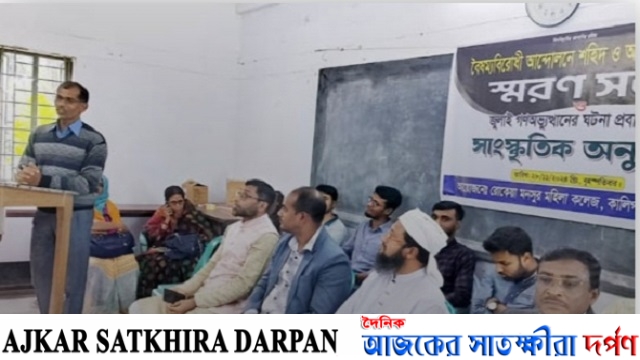 জি এম রাজু আহমেদ নিজস্ব প্রতিনিধি: সাতক্ষীরার কালিগঞ্জ উপজেলা সদরে অবস্থিত রোকেয়া মনসুর মহিলা কলেজে বৈষম্যবিরোধী আন্দোলনে শহিদ ও আহতদের স্মরণ সভা এবং জুলাই গণঅভ্যুত্থানের ঘটনা প্রবাহ নিয়ে সাংস্কৃতিক অনুষ্ঠান অনুষ্ঠিত হয়েছে। বৃহস্পতিবার (২৮ নভেম্বর) বেলা ১টায় কলেজের হলরুমে ভারপ্রাপ্ত অধ্যক্ষ শ্রীবাস চন্দ্র রায়ের সভাপতিত্বে সরকারি নির্দেশনা মোতাবেক এসব অনুষ্ঠানের আয়োজন করা হয়।
