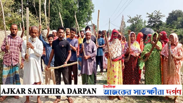 দেবহাটায় ভূমিহীন জনপদে অস্ত্রধারী ভূমিদস্যুদের হামলা; প্রতিবাদে ঝাঁটা মিছিল