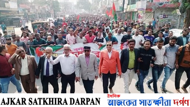 আবু সাঈদ : বাংলাদেশ জাতীয়তাবাদী দল সাতক্ষীরা উপজেলা বিএনপির উদ্যোগে মঙ্গলবার সকাল ১০ ঘটিকার সময় শহরের হাটের মোড়ে মহান বিজয় দিবস উপলক্ষে র্যালি ও সমাবেশ অনুষ্ঠিত হয় । অনুষ্ঠানে প্রধান অতিথি হিসেবে উপস্থিত ছিলেন বাংলাদেশ জাতীয়তাবাদী দল সাতক্ষীরা জেলা শাখার আহবায়ক সৈয়দ ইফতেখার আলী, প্রধান বক্তা হিসাবে ছিলেন জেলা বিএনপির সদস্য সচিব, সাতক্ষীরা ২ আসনের আগামী নির্বাচনে ধানের শীষের কান্ডারী ইউপি চেয়ারম্যান আব্দুল আলিম। বিশেষ অতিথি হিসেবে উপস্থিত ছিলেন সাতক্ষীরা জেলা বিএনপি যুগ্ন আহবায়ক হাবিবুর রহমান হাবিব, অনুষ্ঠানটি সদর উপজেলা বিএনপির আহ্বায়ক এডভোকেট নুরুল ইসলামের সভাপতিত্বে সদর উপজেলা বিএনপি সচিব নূরে আলম সিদ্দিকীর সঞ্চালনার শুরু হয়।অনুষ্ঠানে আরো উপস্থিত ছিলেন জেলা জেলা যুবদলের সাবেক সভাপতি আবু জাহিদ ডাবলু কৃষক দলের আহ্বায়ক সালাউদ্দিন লিটন, সদস্য সচিব রবিউল ইসলাম, জেলা মৎস্যজীবী দলের যুগ্ন আহবায়ক মাহমুদুল হক, পৌর বিএনপি যুগ্ম আহ্বায়ক এম,এ রাজ্জাক, জেলা স্বেচ্ছাসেবক দলের প্রকাশনা বিযয়ক সম্পাদক রাজিবুল ইসলাম,জেলা স্বেচ্ছাসেবক দলের ১ নম্বর সহ সাংগঠনিক সম্পাদক ইসমাইল হোসেন নিরব প্রমুখ। সমাবেশ সদর উপজেলা বিএনপি ১৪ টা ইউনিয়ন বিএনপি'র আহ্বায়ক/ সদস্য সচিব সহ জেলা বিএনপি অঙ্গ সহযোগী সংগঠনের সকল পর্যায়ের নেতা ও কমীরা অংশগ্রহণ করেন। সমাবেশ শেষে নেতাকর্মীরা একটি র্যালি নিয়ে শহরের বিভিন্ন সড়ক প্রদক্ষিণ করে নিউমার্কেট এলাকায় শেষ হয়।