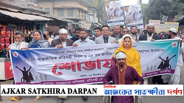 নিজস্ব প্রতিনিধি: "প্রতিবন্ধী ব্যক্তিদের সাথে সম্মিলিত অংশগ্রহণ, নিশ্চিত করবে এসডিজি অর্জন" এই স্লোগানকে সামনে রেখে সাতক্ষীরায় ৩২ তম আন্তর্জাতিক প্রতিবন্ধী দিবস ও ২৫ তম জাতীয় প্রতিবন্ধী দিবস উপলক্ষে র্যালি ও আলোচনা সভা অনুষ্ঠিত হয়েছে। রবিবার (৩ ডিসেম্বর) সকাল সাড়ে ৯ টায় জেলা প্রশাসন, জেলা সমাজ সেবা অধিদপ্তর, প্রতিবন্ধী সেবা ও সাহায্য কেন্দ্র, স্বেচ্ছাসেবী প্রতিষ্ঠান সমূহের আয়োজনে সাতক্ষীরা শহীদ আব্দুর রাজ্জাক পার্ক হতে এক র্যালি বের হয়ে প্রধান প্রধান সড়ক প্রদক্ষিণ করে জেলা শিল্পকলা একাডেমী মিলনায়তনে আলোচনা সভা অনুষ্ঠিত হয়। অনুষ্ঠানের শুরুতে স্বাগত বক্তব্য রাখেন সমাজ সেবা কার্যালয়ের সহকারী পরিচালক মো. রোকনুজ্জামান। আলোচনা সভায় জেলা সমাজ সেবা অধিদপ্তরের উপ-পরিচালক সন্তোষ কুমার নাথ এর সভাপতিত্বে প্রধান অতিথি হিসেবে বক্তব্য রাখেন অতিরিক্ত জেলা প্রশাসক (সার্বিক) শেখ মঈনুল ইসলাম মঈন। এসময় বক্তব্য রাখেন , সহকারী কমিশনার এস এম আকাশ, জেলা তথ্য অফিসার জাহারুল ইসলাম টুটুল, সাতক্ষীরা শহর সমাজ সেবা অফিসার মিজানুর রহমান, রহমান,ডাঃ হাবিবুর রহমান, জেলা প্রতিবন্ধী কল্যান সমিতির সভাপতি মো. আবুল কালাম, সুইড খাতিমুন্নেছা হানিফ লস্কর বুদ্ধিপ্রতিবন্ধী বিদ্যালয়ের প্রধান শিক্ষক মো. রফিকুল ইসলাম। এসময় জেলা শিল্পকলা শিশু বিষয়ক কর্মকর্তা রিয়াজুল ইসলাম, রিসোর্স শিক্ষক আব্দুস সামাদ, ঋশিল্পীর ডাইরেক্টর ইনচার্জ সেলিমুল ইসলাম, রিসোর্স শিক্ষক মো. আব্দুস সামাদ, নবদিগন্ত সংস্থার নির্বাহী পরিচালক বজলুর রহমান, সম্প্রীতি এইড ফাউন্ডেশনের নির্বাহী পরিচালক সভা রঞ্জন।