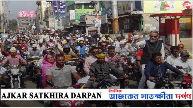 আলহাজ্ব মো: মিজানুর রহমান সাতক্ষীরা: মোটরসাইকেল ও ঘোড়ার গাড়ি নিয়ে সাতক্ষীরায় আওয়ামী লীগ সরকারের উন্নয়ন চিত্র সাধারণ মানুষের মাঝে তুলে ধরতে বর্ণাঢ্য আয়োজনের মধ্যদিয়ে শান্তি সমাবেশ ও উন্নয়ন শোভাযাত্রা অনুষ্ঠিত হয়েছে। বৃহস্পতিবার (২৬ অক্টোবর) সকালে সাতক্ষীরা সদর ও জেলা আওয়ামী লীগসহ সকল অঙ্গসংগঠনের সমর্থকদের আয়োজনে সাতক্ষীরা সরকারি কলেজ মাঠে এ শান্তি সমাবেশ অনুষ্ঠিত হয়। শান্তি সমাবেশে সাতক্ষীরা সদর উপজেলা আওয়ামী লীগের সভাপতি শেখ আব্দুর রশিদের সভাপতিত্বে প্রধান অতিথি হিসেবে বক্তব্য রাখেন জেলা আওয়ামী লীগের যুগ্ম সাধারণ সম্পাদক, সদর উপজেলা চেয়ারম্যান ও দ্বাদশ জাতীয় সংসদ নির্বাচনে সাতক্ষীরা-২ আসনের আওয়ামী লীগের দলীয় মনোনয়ন প্রত্যাশী মো. আসাদুজ্জামান বাবু। এসময় প্রধান অতিথির বক্তব্যে আসাদুজ্জামান বাবু বলেন, প্রধানমন্ত্রী শেখ হাসিনার নেতৃত্বে গোটাবিশ্বে বাংলাদেশ আজ মাথা উঁচু করে দাড়িয়েছে। আওয়ামী লীগ সরকারের উন্নয়ন দেখে দিশেহারা হয়ে পড়েছে বিরোধী রাজনৈতিক দলগুলো। তাই তারা অহেতুক অরাজগতা সৃষ্টি করে নির্বাচন বানচালের পাঁয়তারায় মেতেছে। বিরোধী দলের অপকর্ম ও অপপ্রচারকে রাজনৈতিক ভাবে মোকাবেলা করতে হবে। সেই সাথে দলের ভিতরের যে সকল হাইব্রিড নেতারা দলের ক্ষতি করছে তাদের বিরুদ্ধেও রুখে দাড়াতে হবে। যাতে করে দলের বড় ধরনের ক্ষতি করতে না পারে। এজন্য দলীয় নেতাকর্মীদের সতর্ক থাকার আহব্বান জানান তিনি।