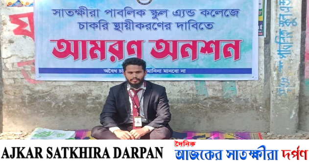 নিজস্ব প্রতিনিধি : সাতক্ষীরা পাবলিক স্কুল এ্যান্ড কলেজে চাকুরী স্থায়ীকরণের দাবিতে আমরণ অনশনে বসেছেন ঐ স্কুলের শিক্ষক আক্তারুল ইসলাম। পাবলিক স্কুল এ্যান্ড কলেজের অধ্যক্ষ কামাল উদ্দিন কর্তৃক কোন ধরনের নোটিশ বা পূর্ব সতর্কতা ছাড়াই চাকুরি থেকে বের করে দেওয়ার প্রতিবাদে রবিবার (০৭ ডিসেম্বর) সকাল সাড়ে ৯টায় ঐ স্কুলের সামনে চাকুরী ফিরে পেতে এ আমরণ অনশনে বসেছেন ঐ শিক্ষক। তার লিখিত অভিযোগের লিফলেট উল্লেখ করেছেন যে, আজ আমি এখানে 'অবস্থান কর্মসূচি' পালন করছি 'সাতক্ষীরা পাবলিক স্কুল এ্যান্ড কলেজ' নামক উক্ত প্রতিষ্ঠানটির কিছু জালিয়াতির আমলনামা পেশ করার জন্য, আমার সাথে ঘটে যাওয়া জুমুল-নির্যাতন ও প্রচলিত আইন বিরোধী অবস্থানের সম্পর্কে জনগণকে অবগত করার জন্য ও সঠিক প্রতিকার পেতে এবং বাংলাদেশ নামক রাষ্ট্রের অতি সামান্য একজন শিক্ষক হিসাবে রাষ্ট্রের কাছে জরুরি কিছু আবেদন পেশ করার জন্য।