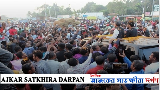হাজারো জনতার ফুলেল শুভেচ্ছায় সিক্ত হলেন আসন্ন দ্বাদশ জাতীয় সংসদ নির্বাচনে সাতক্ষীরা-২ (সদর) আসনে বাংলাদেশ আওয়ামী লীগ মনোনীত নৌকা প্রতীকের প্রার্থী জেলা আওয়ামী লীগের যুগ্ম-সাধারণ সম্পাদক, সদ্য সাবেক উপজেলা পরিষদ চেয়ারম্যান মো: আসাদুজ্জামান বাবু। নৌকা প্রতীকে মনোনয়ন পেয়ে মো: আসাদুজ্জামান বাবু দলীয় নেতাকর্মীদের নিয়ে গোপালগঞ্জের টুঙ্গিপাড়ায় জাতির পিতা বঙ্গবন্ধু শেখ মুজিবুর রহমানের সমাধিতে শ্রদ্ধা নিবেদন করে নিজ নির্বাচনী এলাকায় পৌছানোর সময় পাটকেলঘাটা কুমিরা এলাকায় সাতক্ষীরা সদরের দলীয় হাজার হাজার নেতা-কর্মী-সমর্থকরা তাকে ফুলেল শুভেচ্ছায় বরণ করে নেন। এসময় মো: আসাদুজ্জামান বাবু হাজারো জনতার শুভেচ্ছা গ্রহণ করেন এবং হাত নেড়ে অভিবাদন জানান।